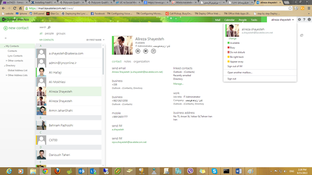 یکی از امکانات منحصر به فرد نرم افزار Microsoft Lync 2013 یکپارچه سازی با نرم افزار Microsoft Exchange 2013 می باشد با استفاده از این امکان شما می توانید بدون محدودیت از Contact های موجود، در نرم افزار Lync استفاده کرده و به مکالمات خود پردازید .