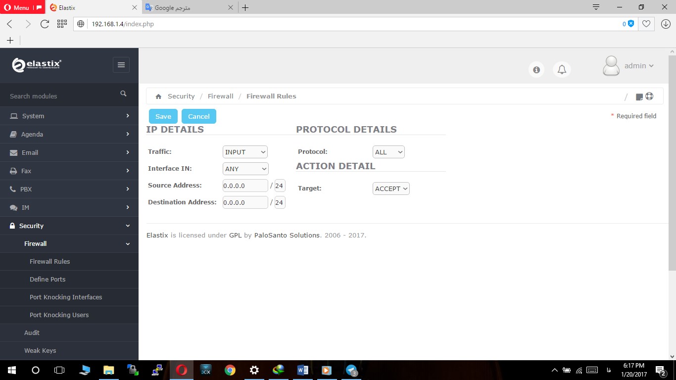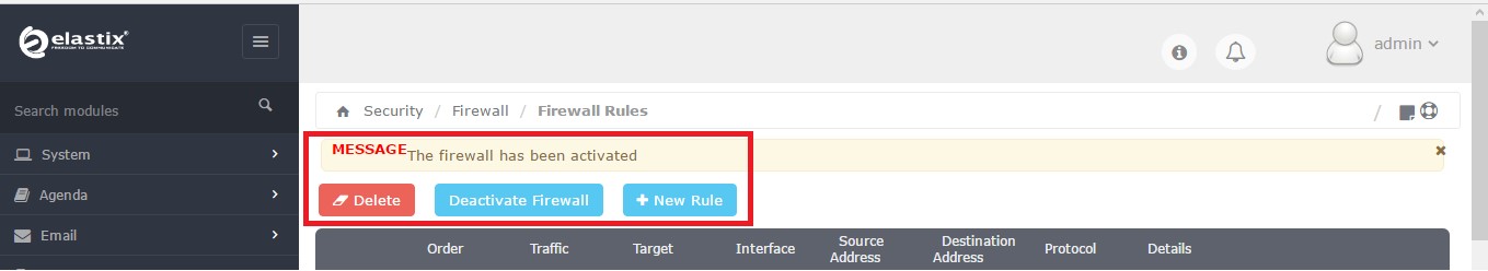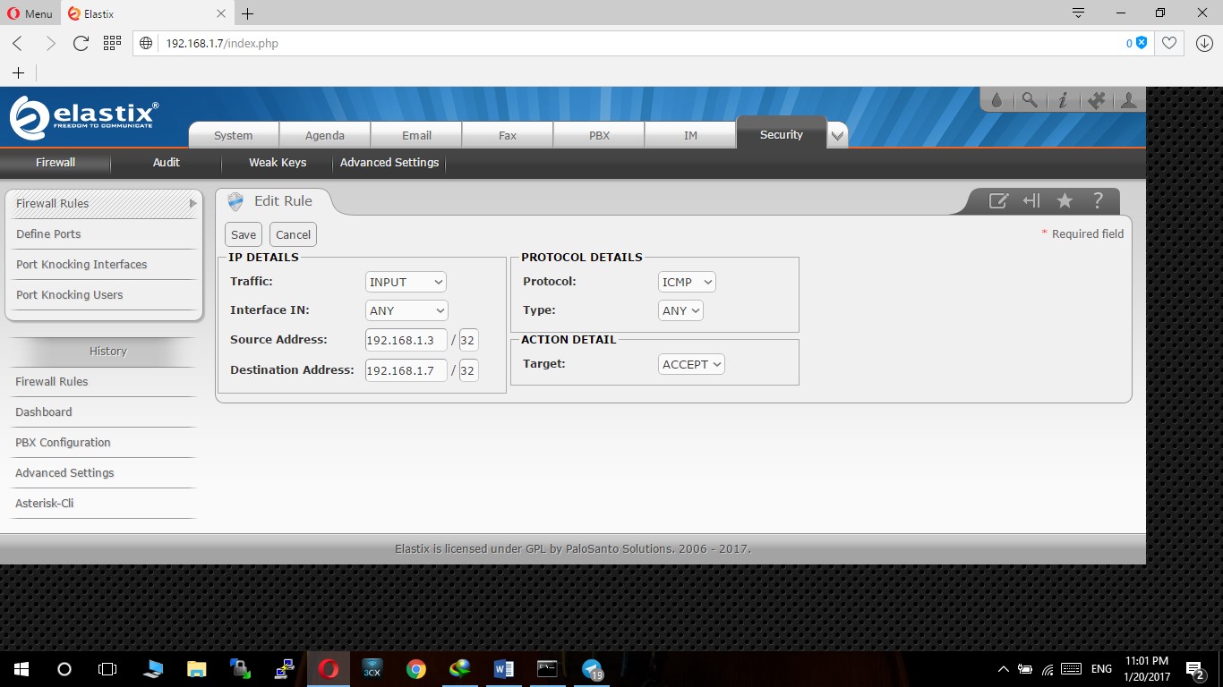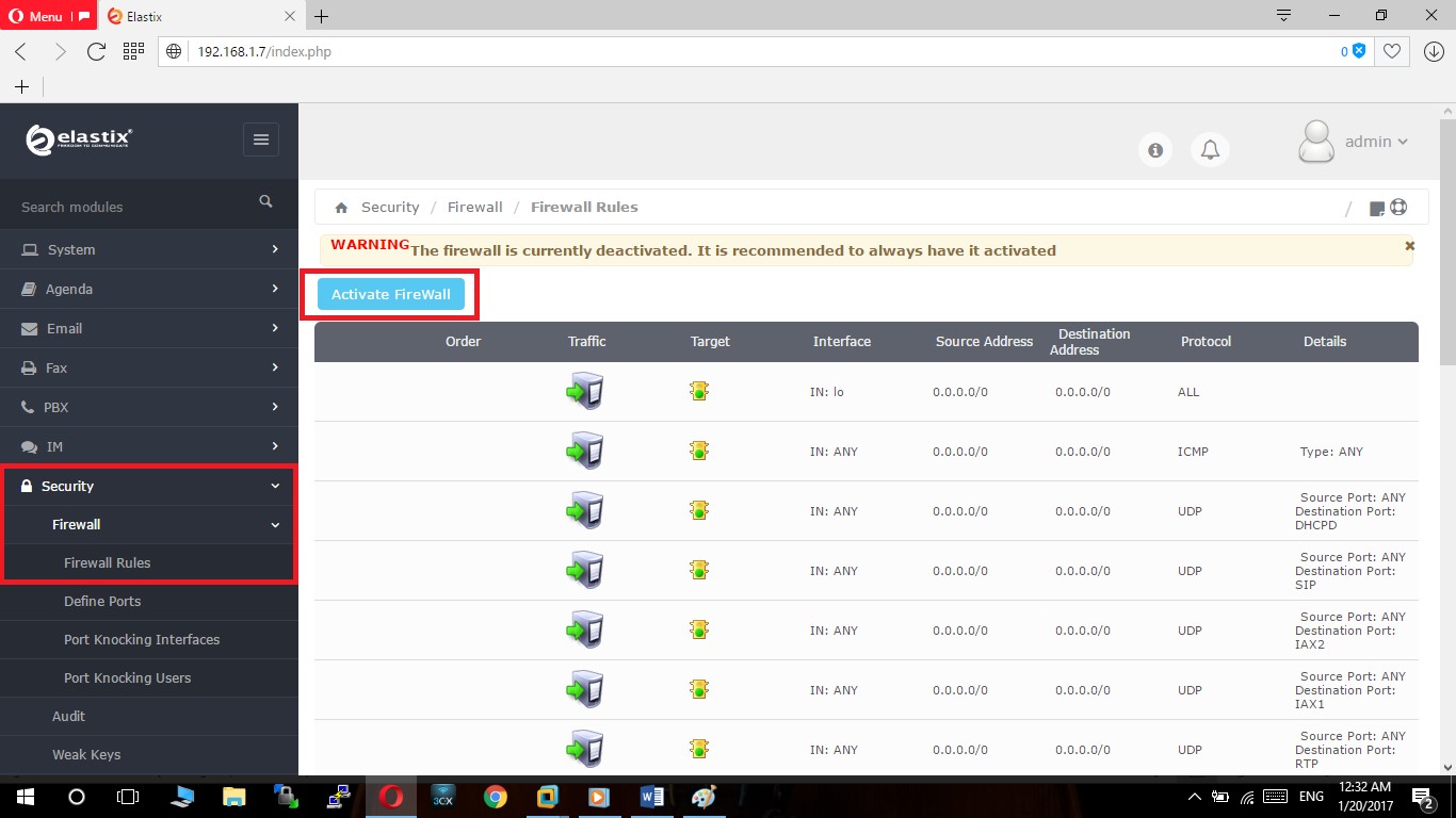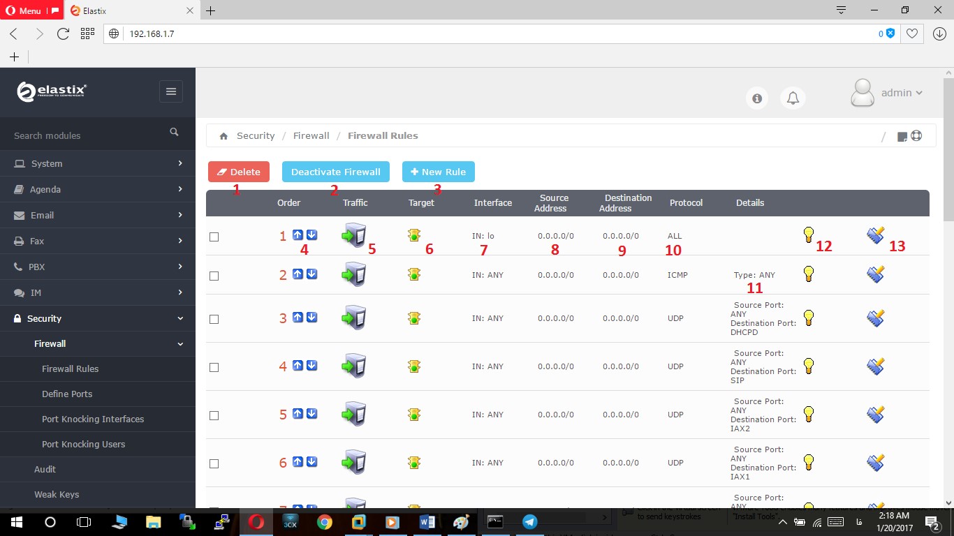 قوانین تمامی دیوارهای آتش از بالا به پایین اجرا می شوند. بنابراین در الستیکس نیز اولویت اجرا از بالاترین قانون است.به صورت پیش فرض در الستیکس قوانینی برای پروتکل هایی نظیر SIP,RTP,IAX2,HTTPS,HTTP و … ساخته شده است که همگی در حالت Accept هستند.و دو قانون آخر با ترافیک های Input و Forward در حالت Reject هستند.همان طور که پیشتر گفته شد در دیوار آتش قوانین از بالا به پایین اجرا می شوند، با توجه به دو قانون آخر اگر پکتی درحال عبور بود و شرایطش مطابق با هیچ قانونی نبود در نهایت Reject می شود.