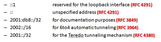 در این گروه از آدرس های IPv6 Unicast تعدادی از آدرس ها جهت استفاده های خاص رزرو شده اند و به این ترتیب از آن ها تنها در همان موارد استفاده می گردد که به شرح زیر می باشند: