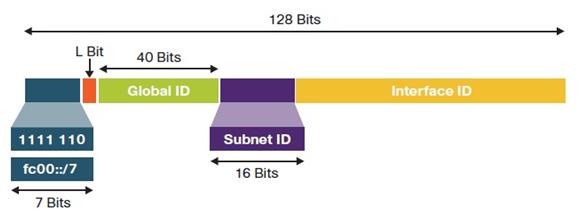 این دسته از آدرس ها بصورت fc00::/7 مورد استفاده می باشند که البته با توجه به رزرو شدن بخشی از این آدرس ها به شکل زیر بازه آن تغییر میکند. به این شکل که در این نوع آدرس بخشی را با عنوان L bit داریم که می تواند 1 یا 0 باشد و با توجه به اینکه 0 رزرو شده می باشد با احتساب 1 در بخش L bit آدرس های ULA بصورت fd00::/8 نشان داده می شوند و بخش های مختلف آن همانند شکل باید در نظر گرفته شود.